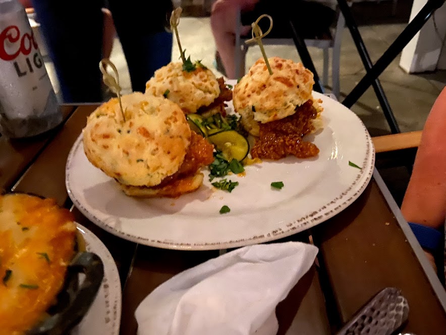 I didn’t snag pictures of EVERYONE’S meal, but I did manage to get a couple pictures beyond my own dish. Like Nickie’s appetizer-as-entrée Thigh High Chicken Biscuits (Three biscuits topped with Chef Art’s famous fried chicken thighs and bread and butter pickles. Drizzled with hot honey).