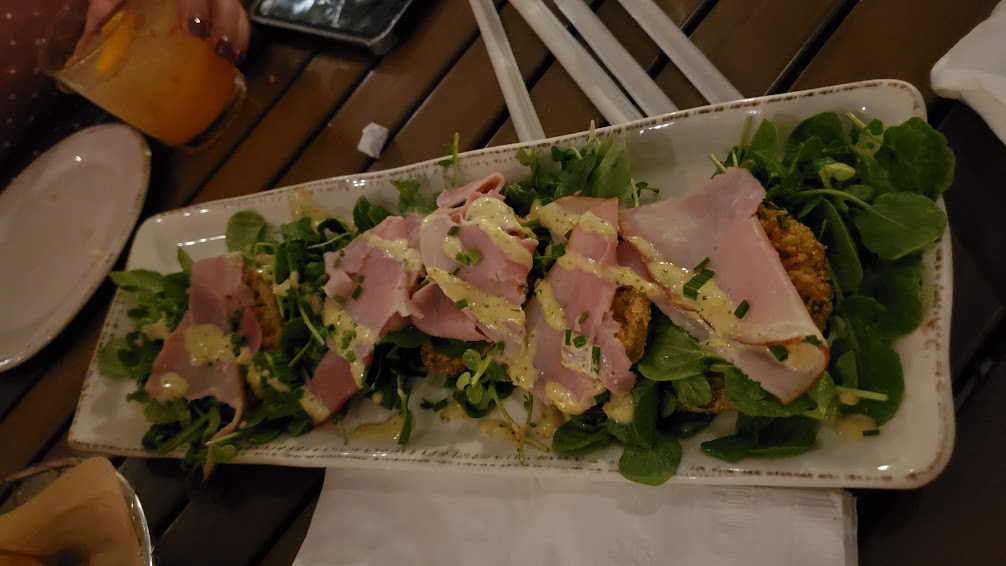 The Bee Haven Bay Fried Green Tomatoes (with Shaved ham, rémoulade sauce, and dressed local greens.)