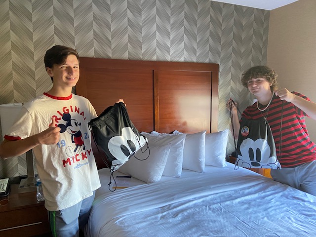 Oh right, I suppose some of you are new to this whole thing. So airport bags are a tradition we have had since our first vacations with the boys. These bags are usually filled with treats and what not for the plane and for the trip. And usually, the actual “bags” were throwaways. But this time around? Mickey and Minnie cinch-sacks!