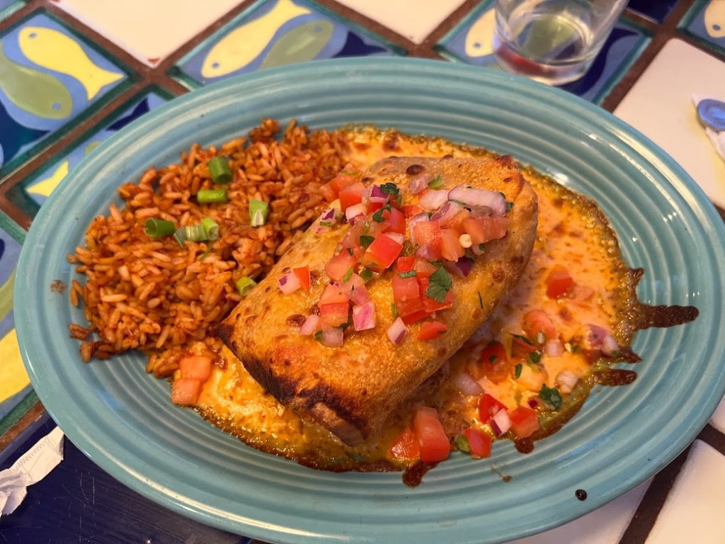 I opted for the Chicken Chimichanga (shredded chicken and cheese, rolled into a flour tortilla, lightly fried, and baked in red chile sauce and cheese) with Mexican rice and beans, guacamole and sour cream.