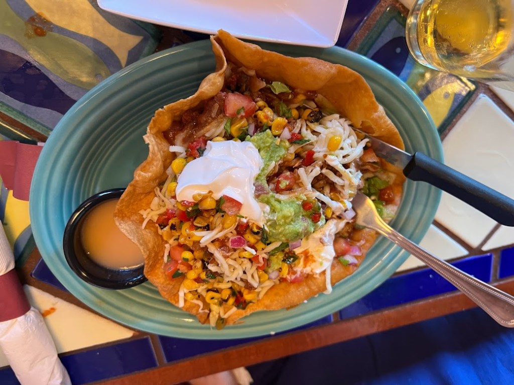 For her main, Nickie ordered the Chicken Taco Salad (Crisp tortilla bowl filled with shredded lettuce, cheese, corn salsa, salsa fresca, and enchilada sauce. Topped with guacamole and sour cream).