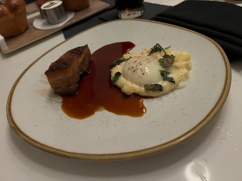 We also ordered a carry-over appetizer from the Wave – the Bacon & Eggs (Maple-Lacquered Pork Belly, Cheese Grits, Perfect Egg).