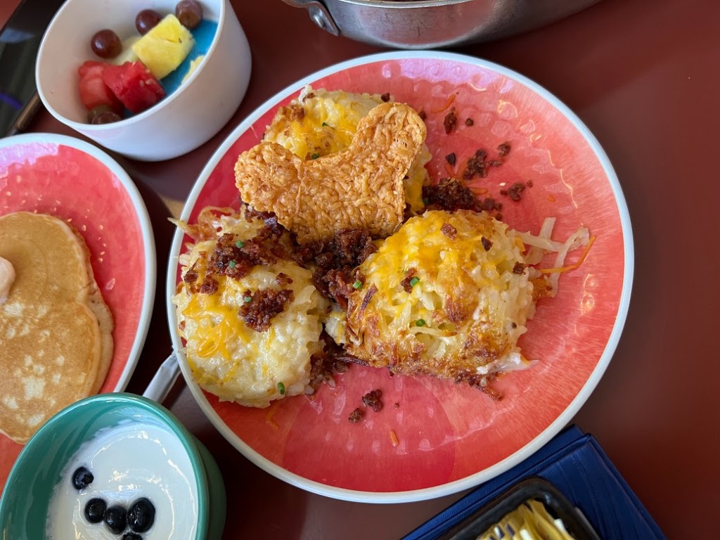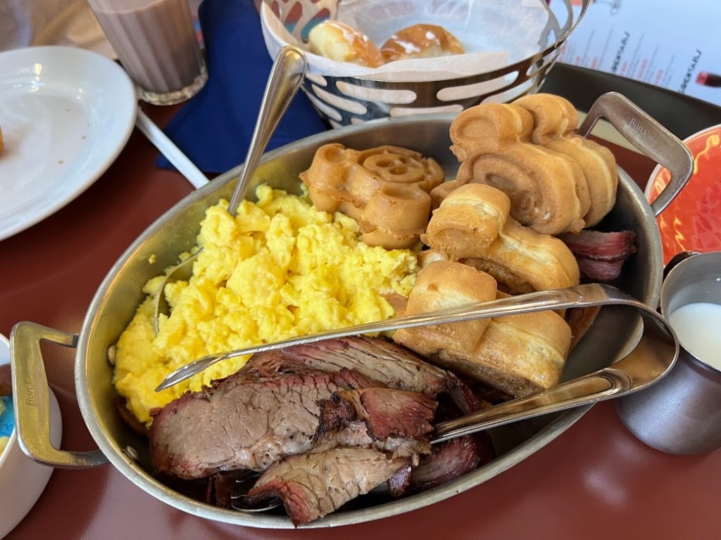 Our server brought out a pan filled with Scrambled Eggs, Pork Sausage Links, Smoked Bacon, Mickey Waffles, and Slow-Roasted Beef Brisket.