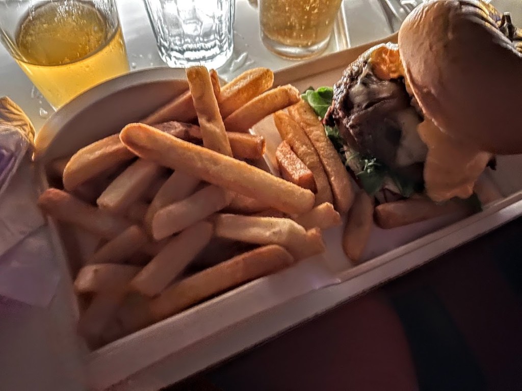 For my entrée (I only got a picture of my entrée), I went with a burger as one does at Sci-Fi. I went with the Feature Film Burger, which is like a burger of the month. The burger of the month this month was the Surf and Turf Burger, which was a burger topped with a crab cake.
