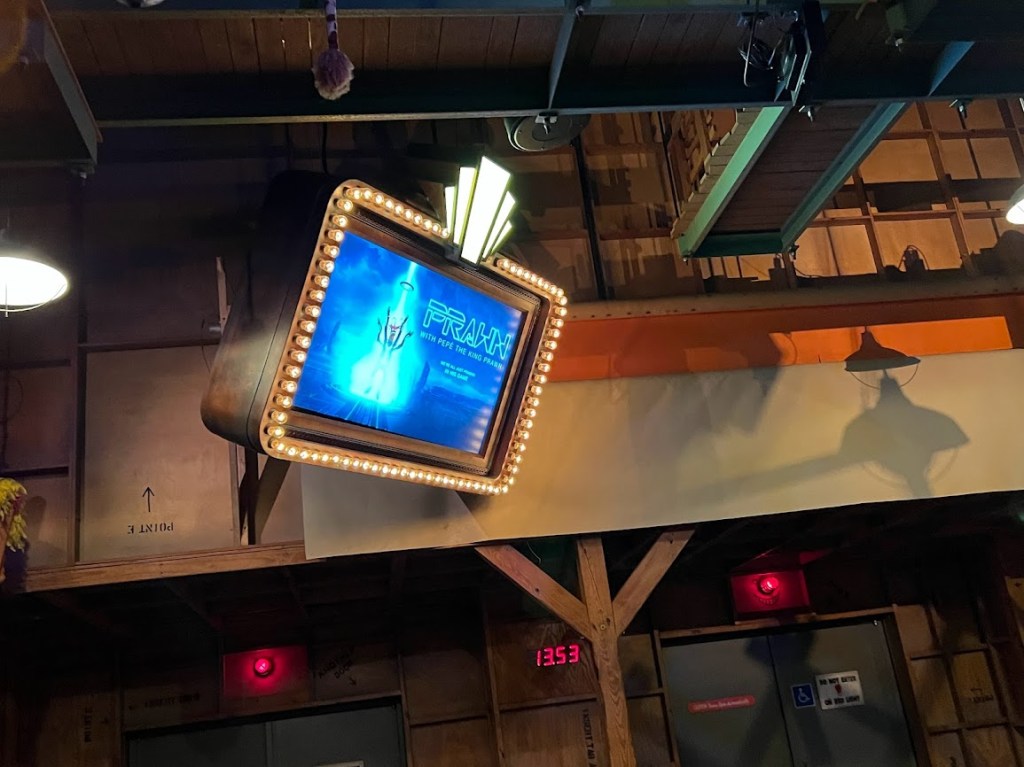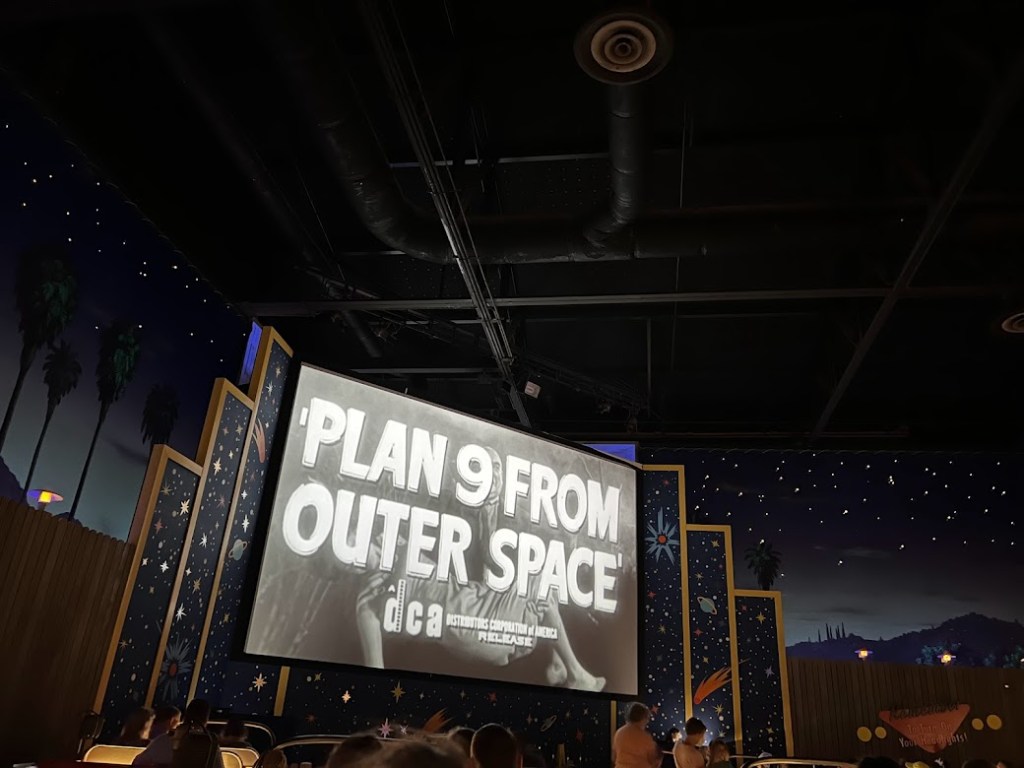 For those that don’t know, Sci-Fi has that whole “outside on the inside” feel, set up like a drive-in with a screen in front showing old trailers, cartoons, and random clips. And while there are traditional-looking tables set up, there are mostly these cars to sit in while you enjoy your meal.