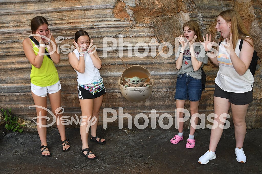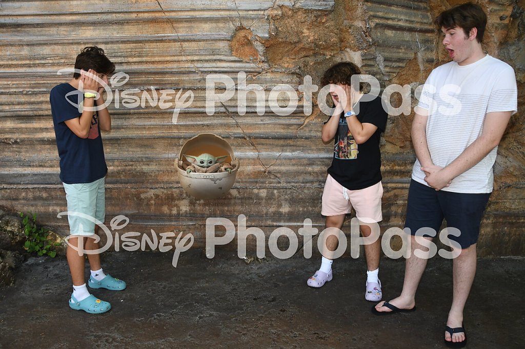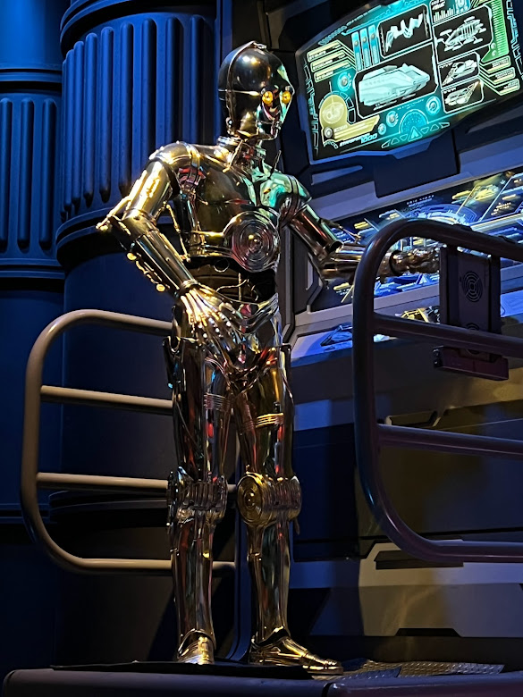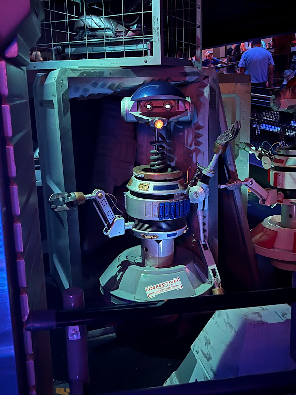 Dinner ended at around 8PM, which was a fine time for dinner to end. Because as you might recall from like 20 pages ago, we had purchased an Individual Lightning Lane for Star Wars: Rise of the Resistance and our time had come. So we all made our way over to Galaxy’s Edge and walked right on through and came face-to-face with this little dude.