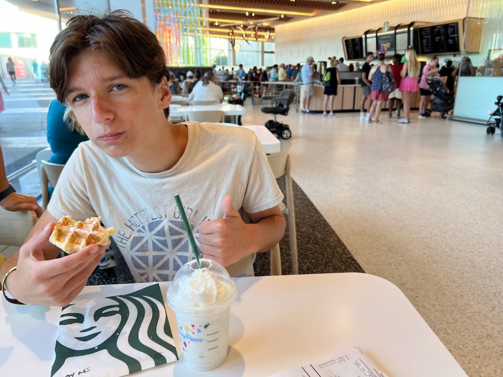 And as you can see, Owen got himself a Vanilla Bean Crème Frappucino and a Liege Waffle.