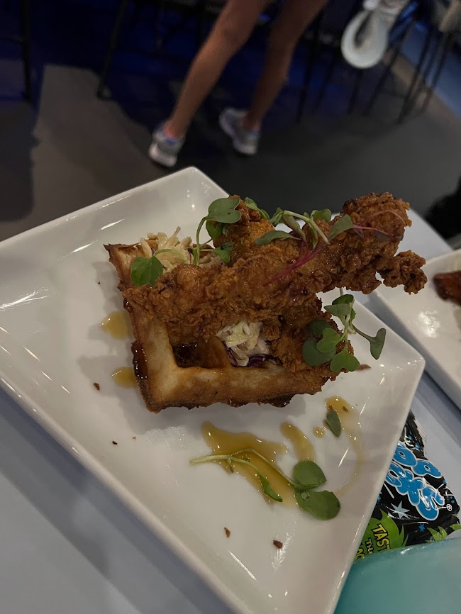 We ordered the Chicken on Waffle (Fried Chicken, Smoked Bacon and Roasted Corn Waffle, Spiced Coleslaw, Bourbon Maple Glaze).