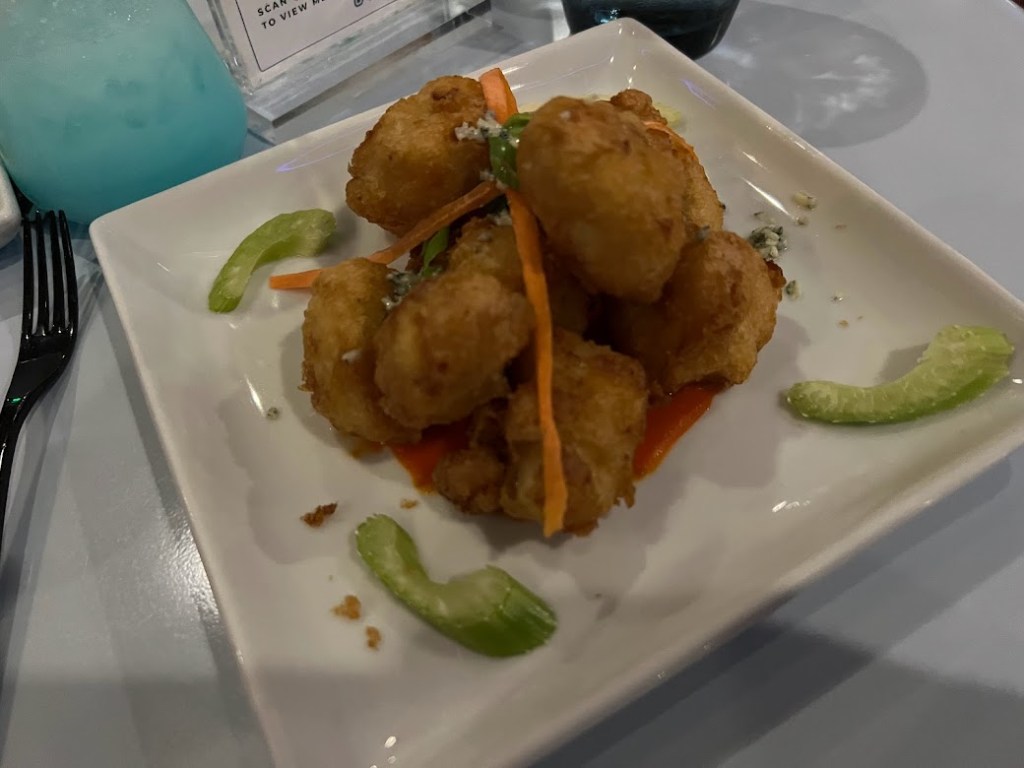The Blue Moon Cauliflower (Tempura Fried Cauliflower, Housemade Hot Sauce, Blue Cheese Dust).