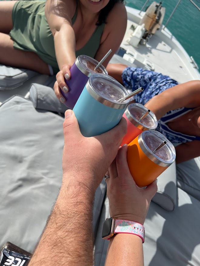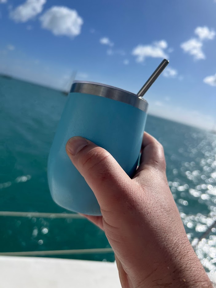While we were relaxing out on the bow, Charlie took our drink orders and the drink of choice appeared to be largely rum punch. Which they served in these colorful insulated stemless wine glasses. That’s what they’re called, right?