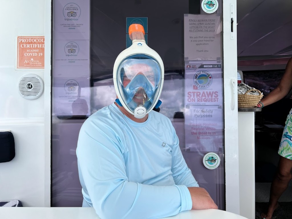 At one point, we pulled into Carlisle Bay for some snorkeling. They provided all the equipment, including choice of standard snorkeling shizz or a tri-board full facemask. I opted for a standard snorkel, mask, and flipper combo while some just went snorkel and mask no flippers. Tony went for the full mask, which was a good thing. Because then I could snap this hilarious photo.