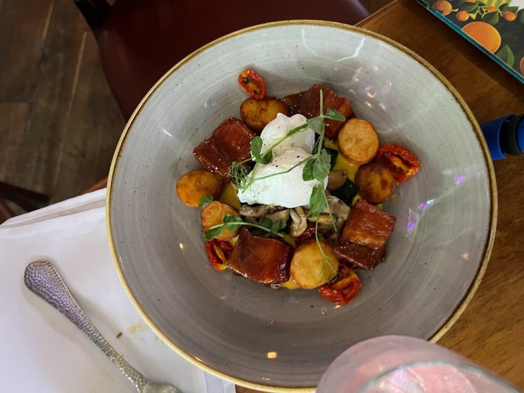 For his main, Myles ordered the Irish Porker – Cider Glazed Pork Belly, Poached Eggs, Smoked Potatoes on Corn Puree, Wild Mushrooms, Spinach and Confit Tomatoes.