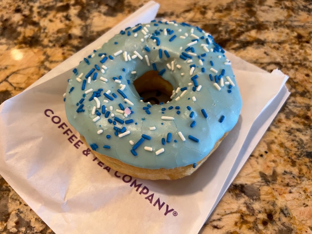 And while we had breakfast coming up in a little bit, that was at least like a half hour away. So we also grabbed a donut to split with the kids that obviously used all-natural coloring in its frosting.