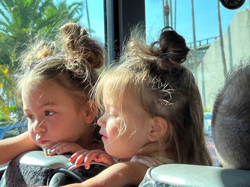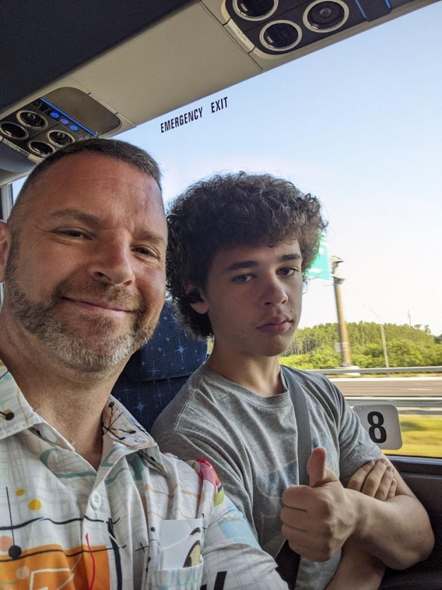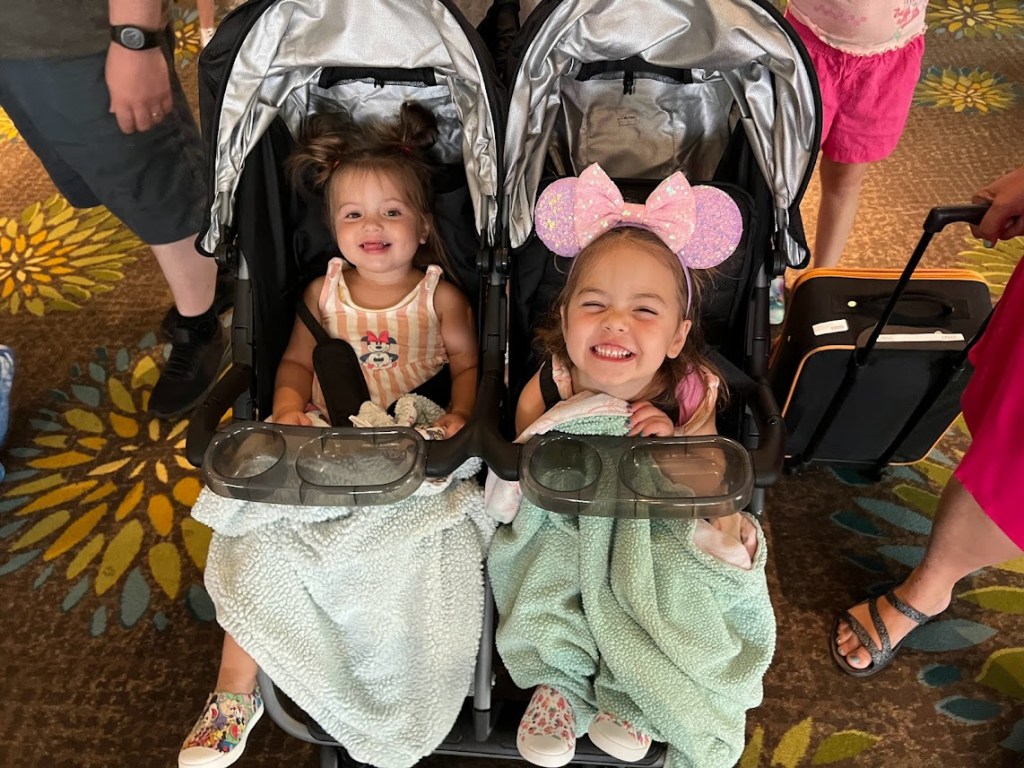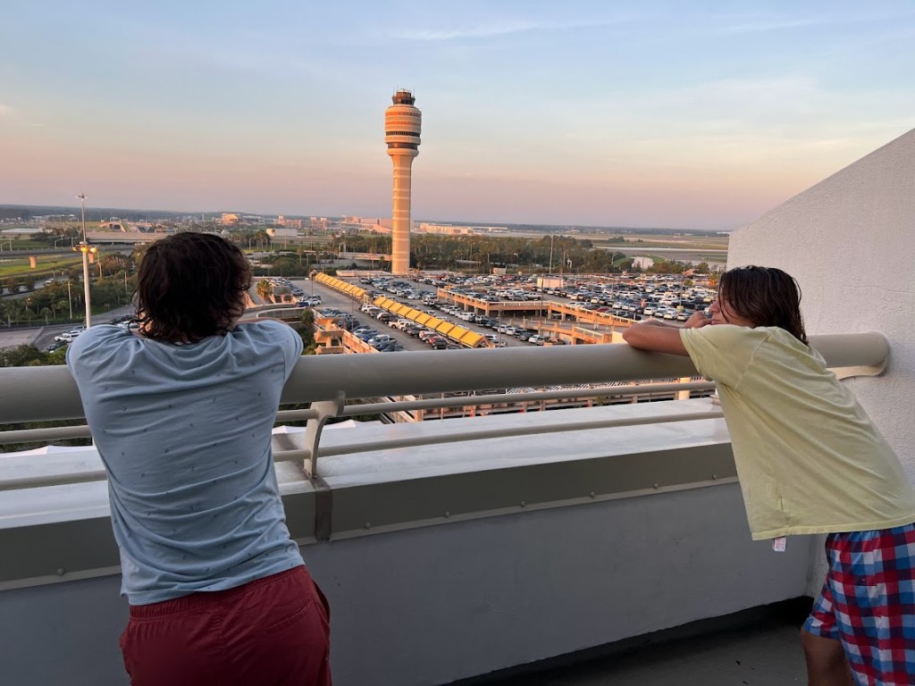 At check-in, Mikey was the sole representative for the Pittman clan, but after we finished our delicious – and nutritious – breakfast, the rest of them came to join us as we were getting in line for the shuttle. Look how excited these two were.