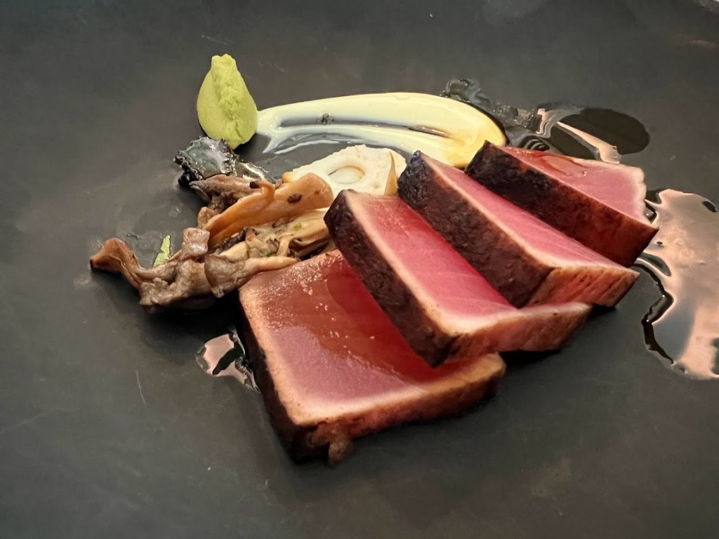 The Alameda Porcini Spiced Ahi Tuna (with Pickled Lotus Root, Oyster Mushroom, Black Sesame Brittle, Wasabi & Yuzu Mayonnaise).