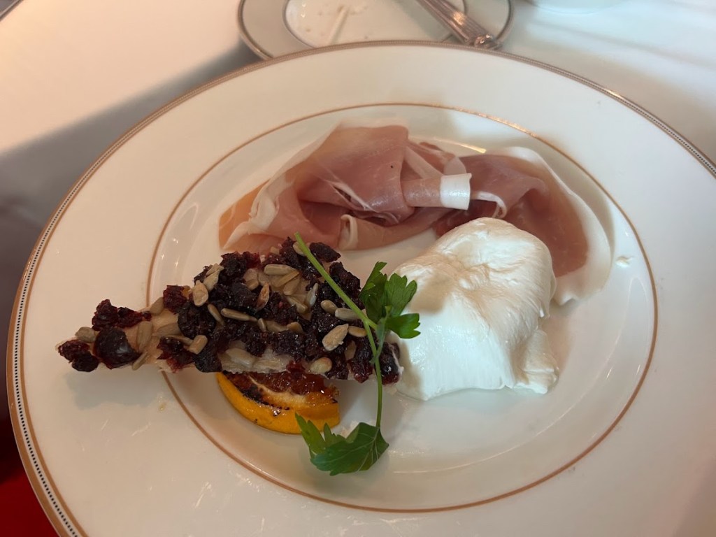 And the Burrata Mozzarella Cheese & Prosciutto di Parma, served with a Crisp Cranberry and Sunflower Seed Phyllo.