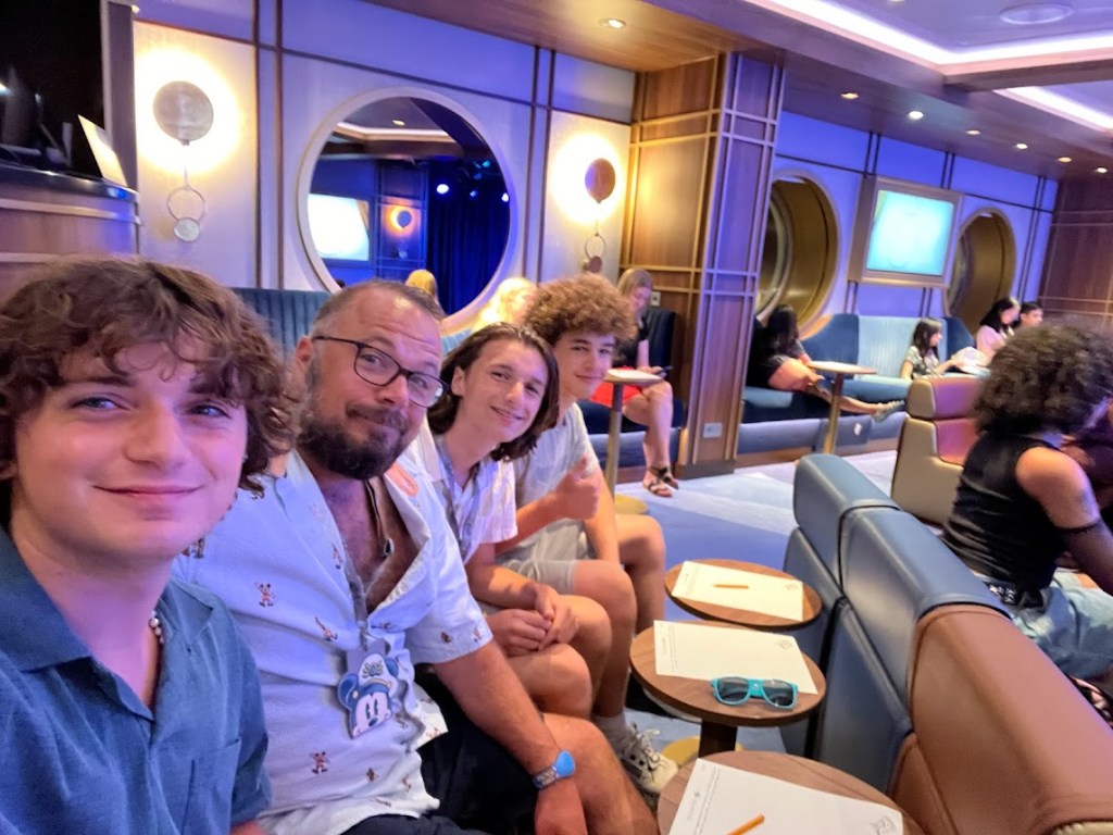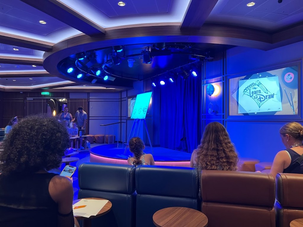 After the show, Robyn and Terry had a bourbon tasting so they headed off while the rest of us looked through our Personal Navigator to see what activities were available for the rest of the night. We toyed with the idea of trivia, maybe going to see a movie, but Myles, Owen, and Jimmy wanted to check out a drawing class so I volunteered to take them while the rest of the crew went up to Deck 11 to watch Enchanted on the Funnelvision screen by the pools.
