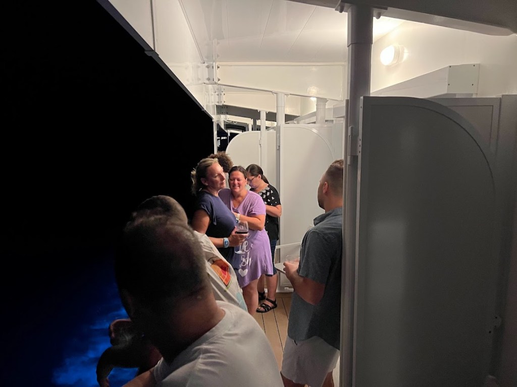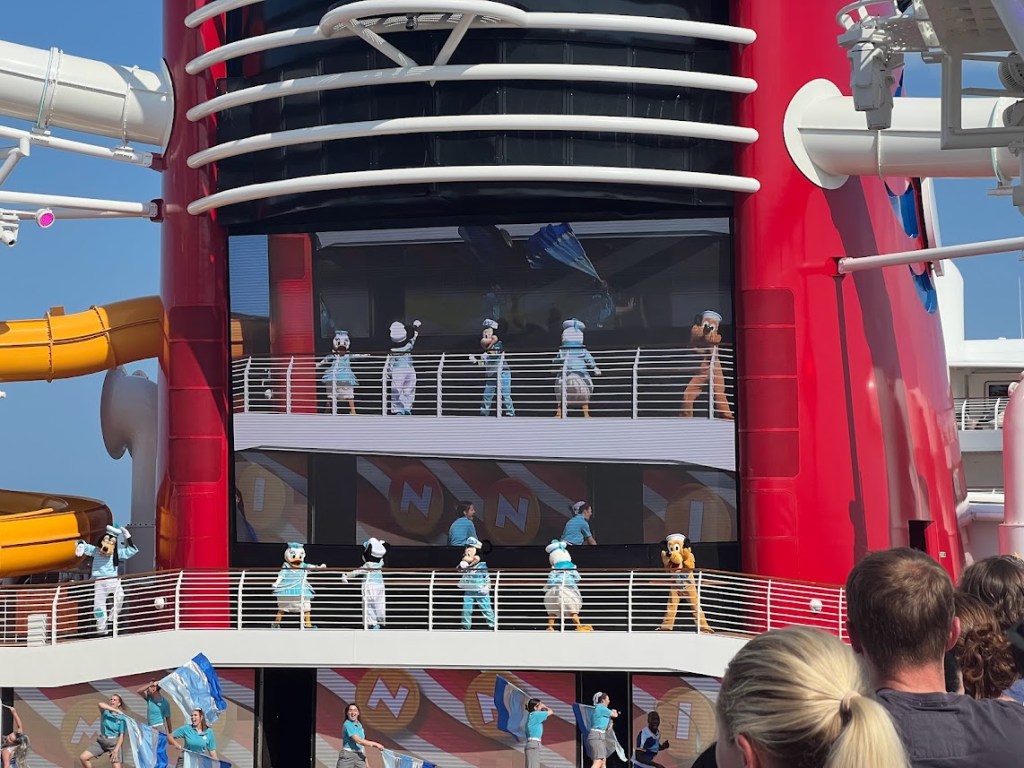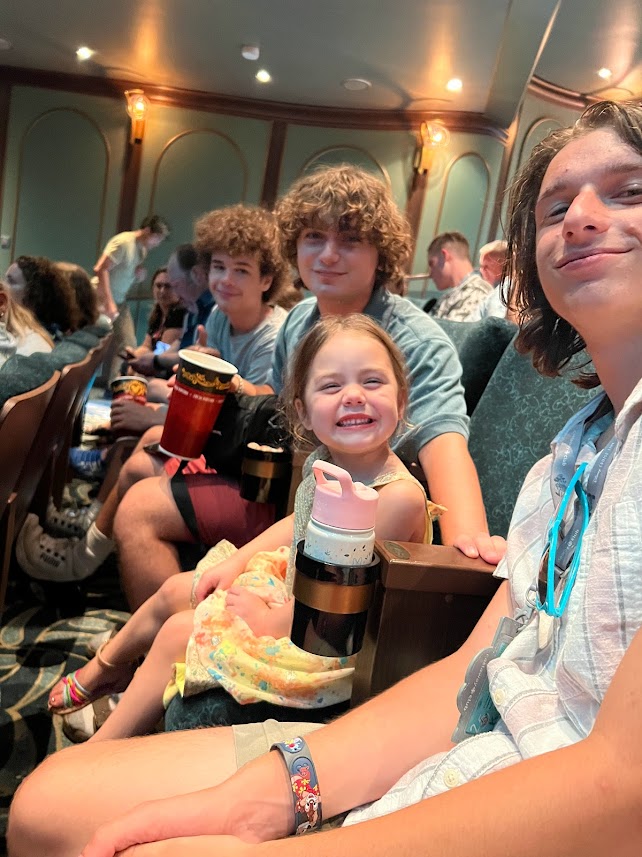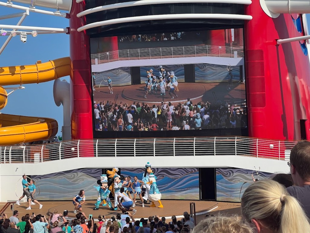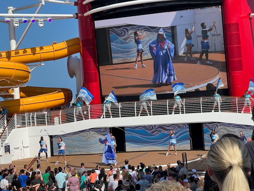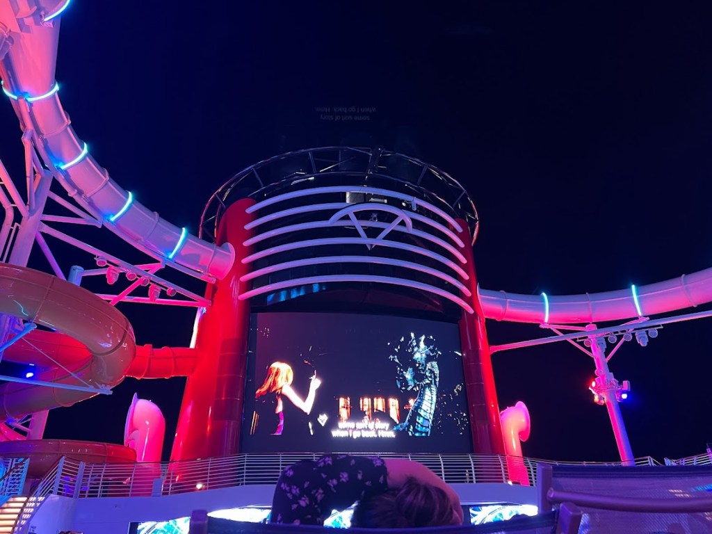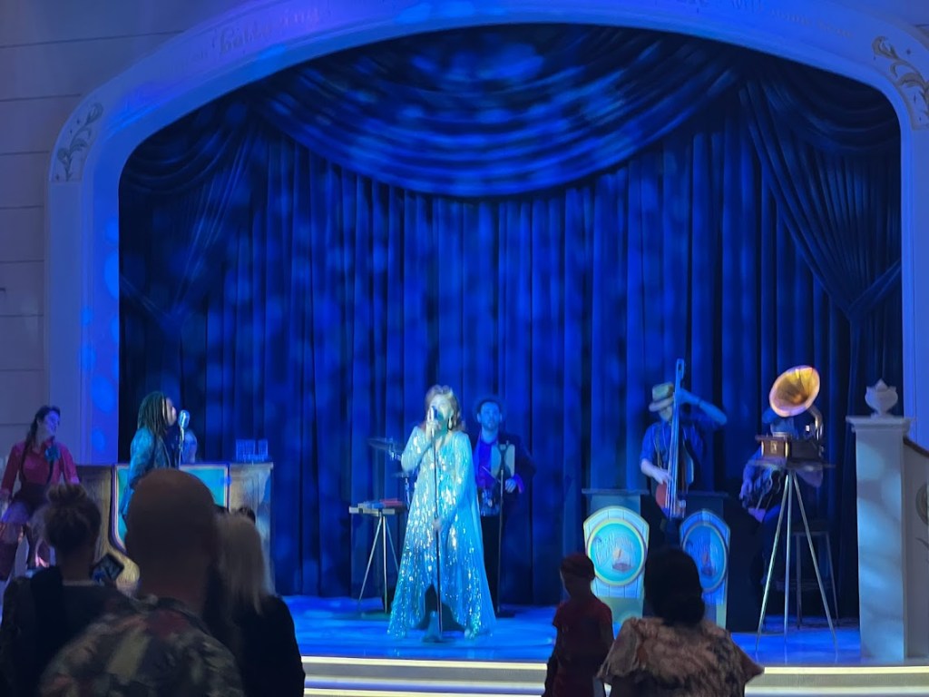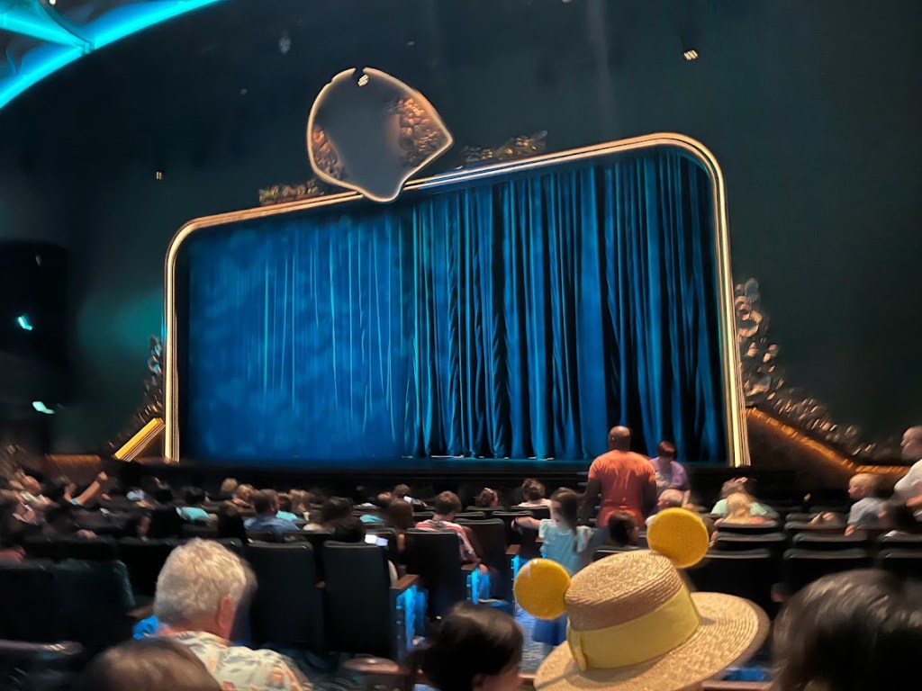 The show tonight was Seas the Adventure. I couldn’t take any pictures during the show, but the overall plot was that Captain Minnie had to turn the job of steering the ship over to Goofy for a little bit and, like, I mean. He’s Goofy. So things don’t really go according to plan. He ends up steering the ship through different scenes featuring Disney characters (such as Tiana, Hercules, Crush, Moana, Elsa, and Merida) and iconic songs.
