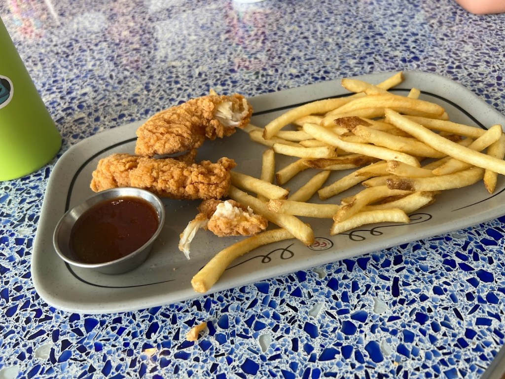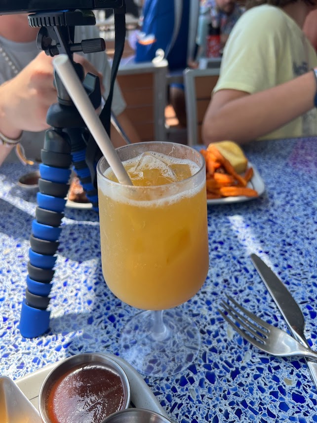 But being that we didn’t want to miss our shuttle, we brought the food back up to the bar area across from McCoy’s. The table said “reserved” so we assumed that was for us. Again, we were in the Mickey group. So.