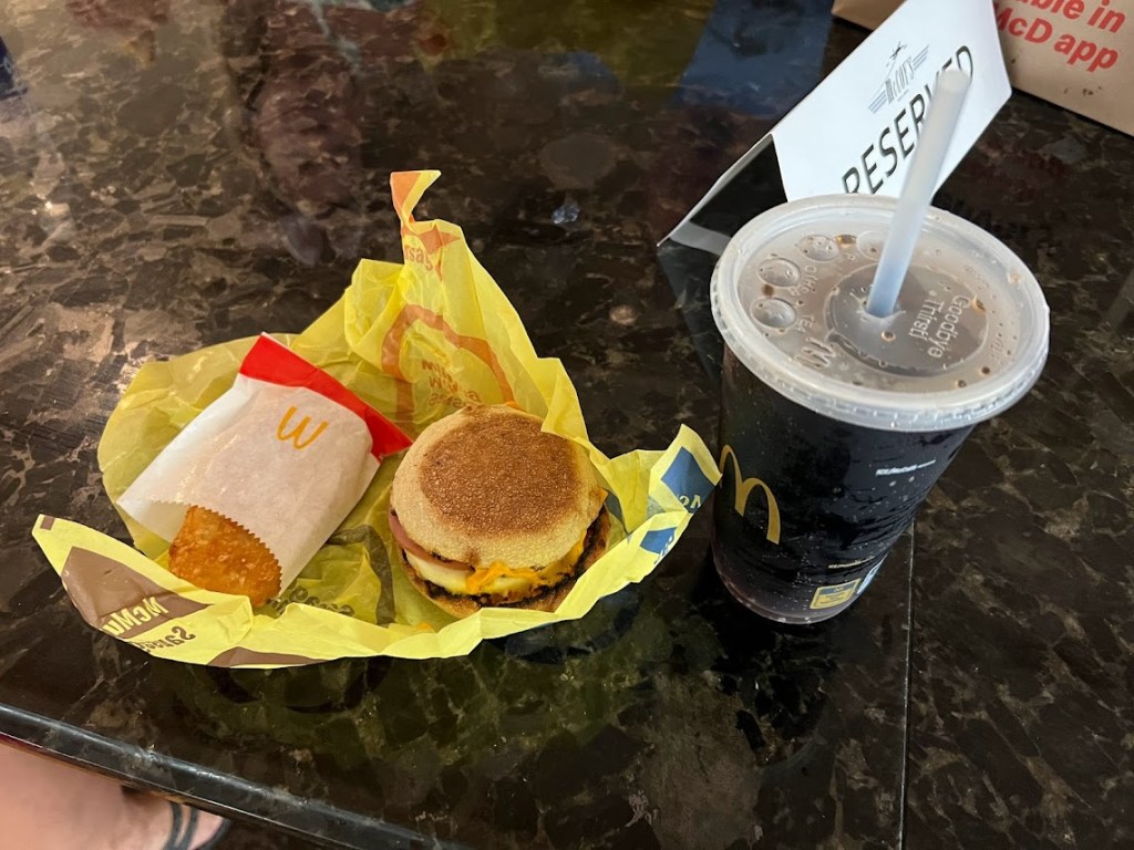 After check-in, we had like a half hour or so until we got on the shuttle so it was back to the airport food court. And since Panda Express has yet to introduce a breakfast offering for some reason, we chose McDonald’s.