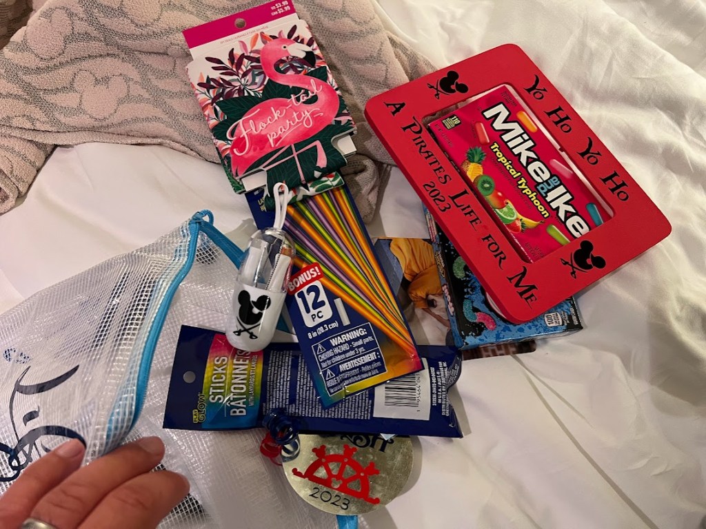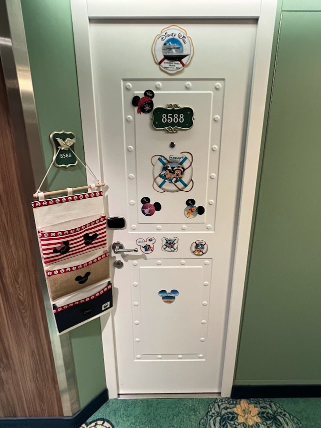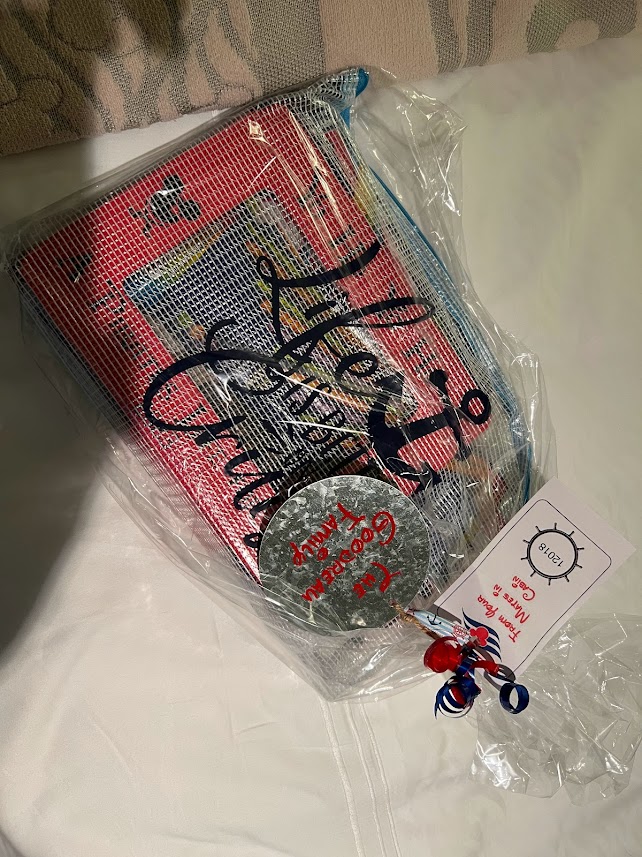 So a fish extender is the little hook thing outside your stateroom door where they leave your key or your bill or something like that. And people use that hook to hang these pockets off for each person staying in their room. And then, these people (us included) join Facebook groups with other people on the same cruise and essentially exchange gifts with each other. You let people know who your favorite characters are and what not and who is in your room and they let you know the same thing and then, like, people leave you gifts and you leave them gifts.