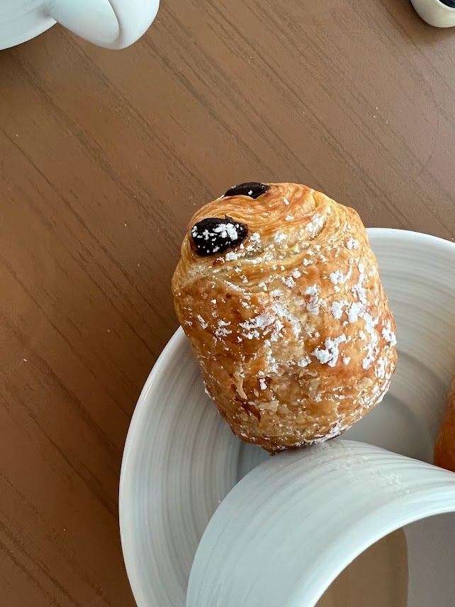 We ordered some orange juice, coffee (both regular and decaf), donuts, plain croissants, chocolate croissants, and Froot Loops.