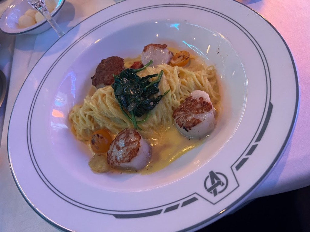 On the left up there is the Golden Mystic Pasta (Caramelized Scallops, Angel Hair, Chardonnay Lemon Saffron Cream, Roasted Vine Tomatoes, Savoy Spinach).