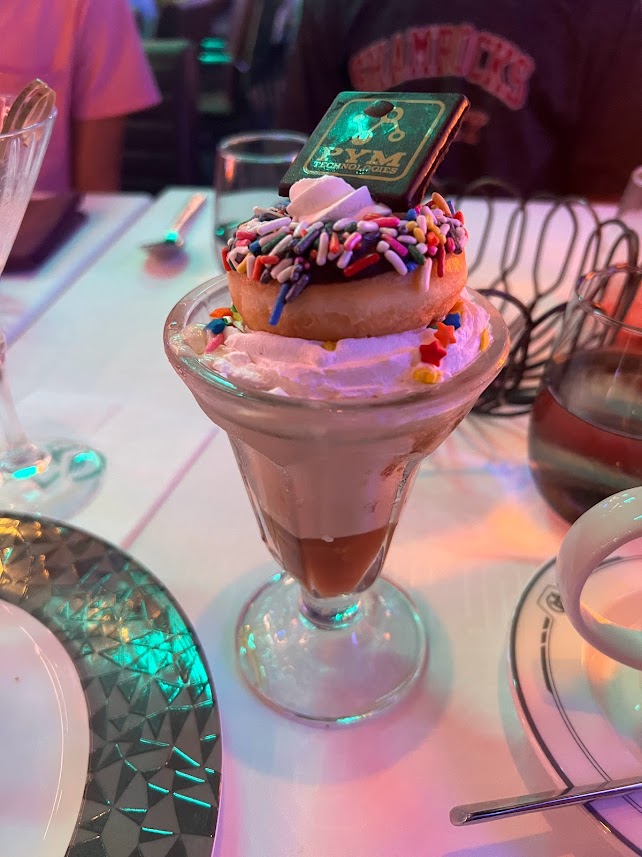 And the Pym Doughnut Sundae (Dulce de Leche Ice Cream. Pecan Brownie. Caramel Fudge Sauce, Chocolate Glazed Mini-Doughnut, Whipped Cream).