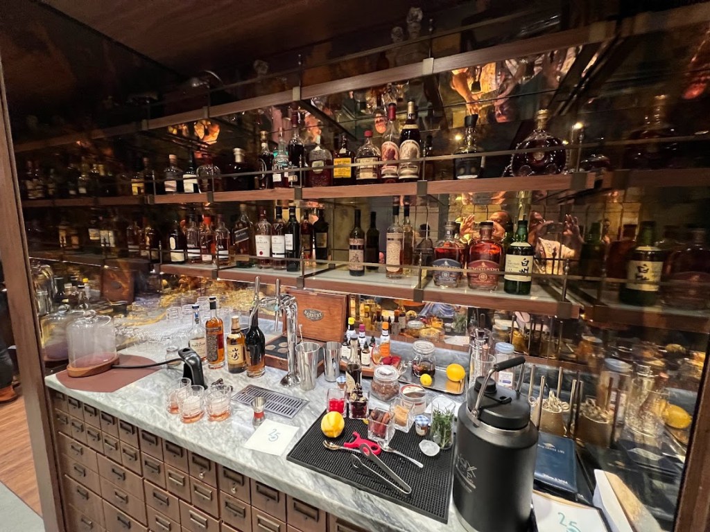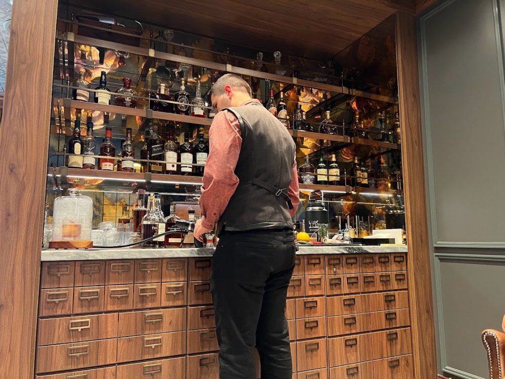 I honestly don’t fully remember everything . I think it was the Old Forrester 1920s Prohibition Style for the spirit. And we chose maybe a cinnamon bitters with, ugh, some type of syrup. And there was definitely a cinnamon stick. And of course we smoked it.