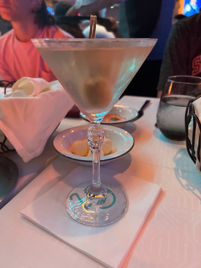 Our waitstaff had finally figured maybe we needed something to wash down our food so my drink did eventually arrive. And once again, I went with a Grey Goose Martini Dirty. This time, awesomely, it arrived dirty and they had the blue cheese stuffed olives up in here.