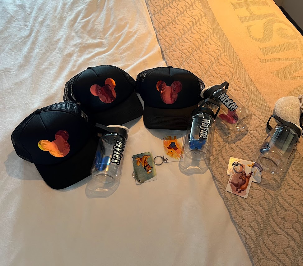 Personalized water bottles, personalized (not only with our names, but with our favorite Disney characters) keycards for our in-room air conditioning, and check out those hats. I LOVED these hats. This has now become my favorite baseball cap. I literally wear it all the time.