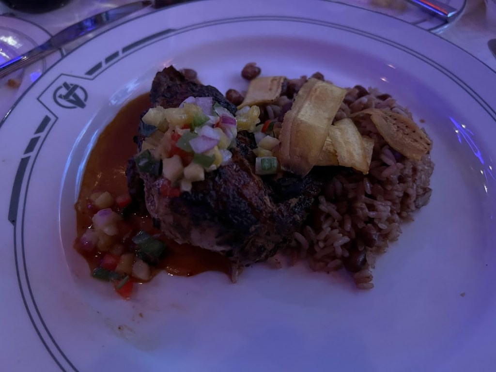 For my entrée, I went with Tia Dalma’s Jerk Chicken. 48-hour Jerk Marinated Chicken, Grilled and served with Rice and Peas, Fried Plantains, and a Pineapple-Chili Salsa.