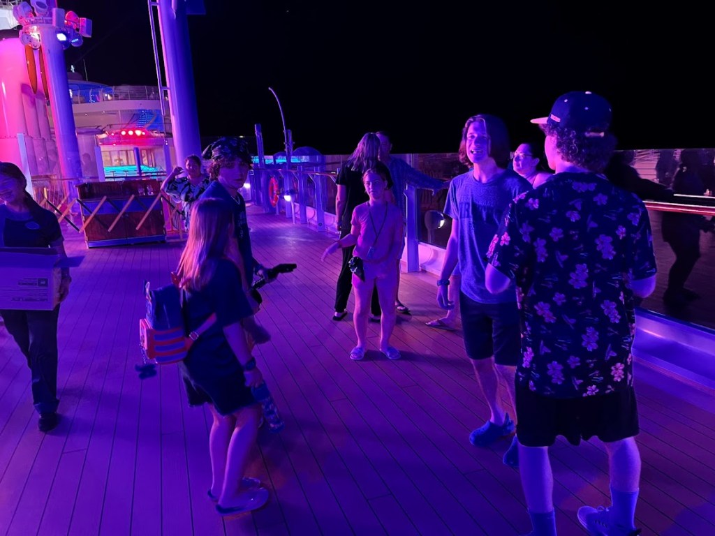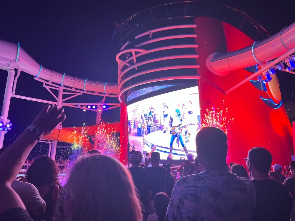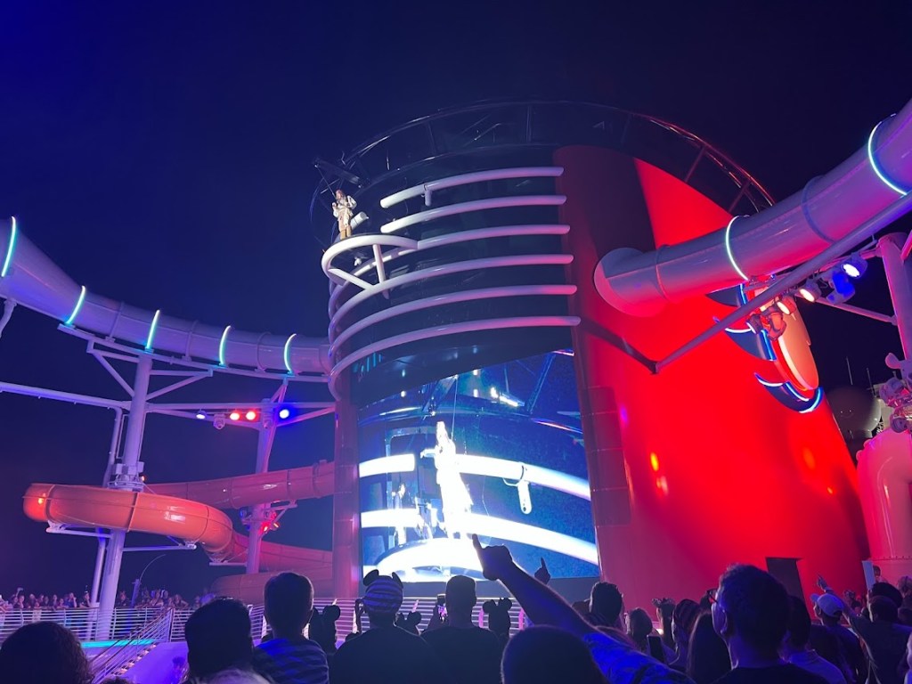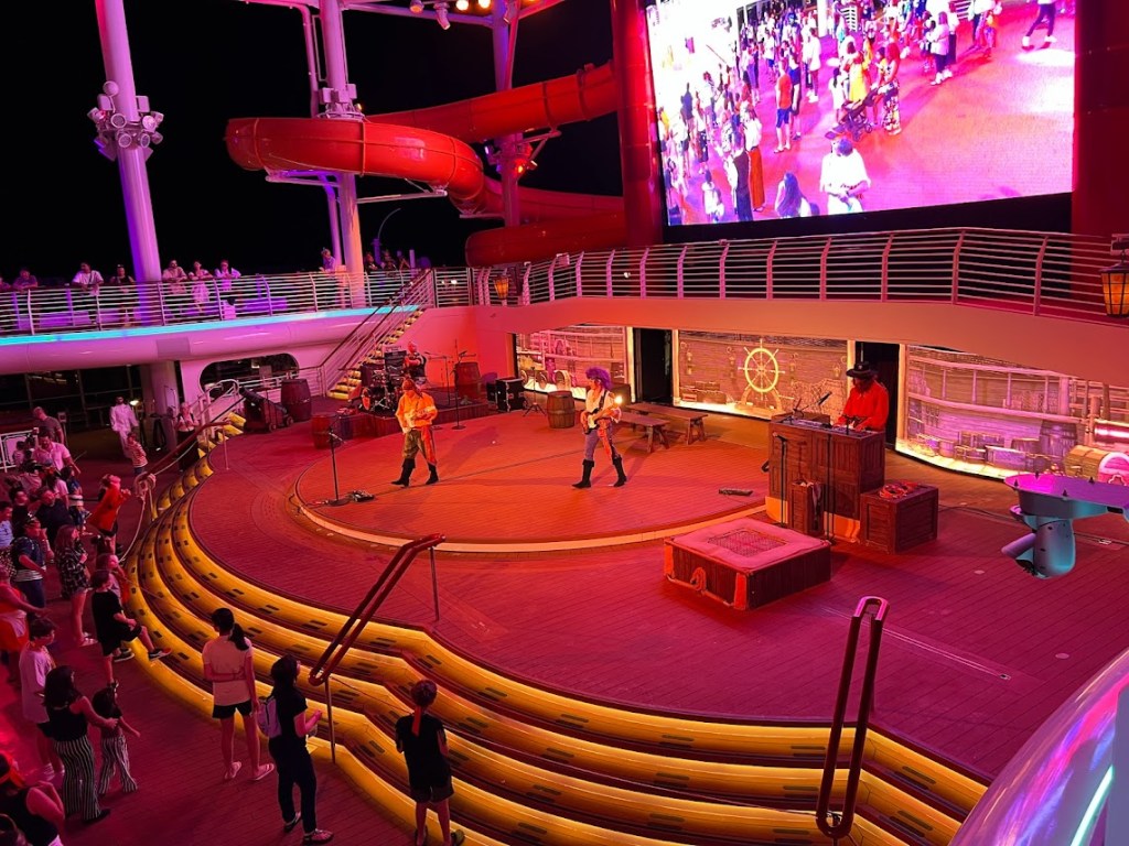 At around 10:00PM, it was time to head back up to Deck 11 for the Pirate’s Rockin’ Parlay Party. Well, actually, some of the kids headed up a little bit earlier than us to secure a spot. When the rest of us got there, we grabbed a spot on the upper deck on the starboard side underneath the AquaMouse. And the kids came to meet us.