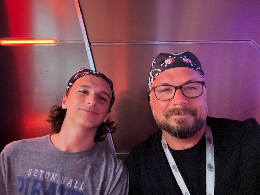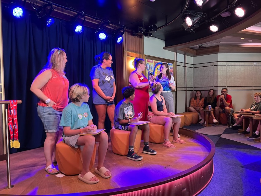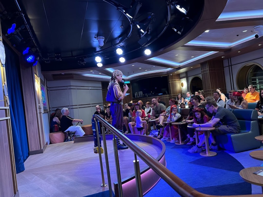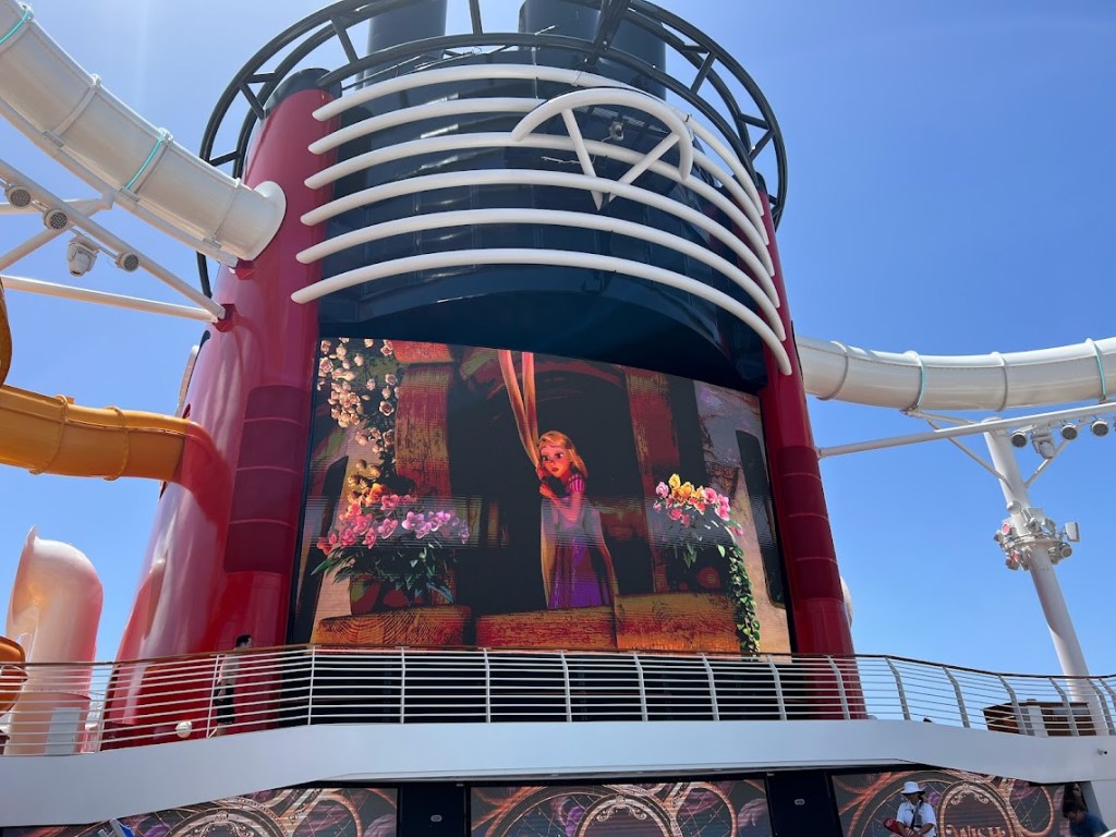 At around 10:00PM, it was time to head back up to Deck 11 for the Pirate’s Rockin’ Parlay Party. Well, actually, some of the kids headed up a little bit earlier than us to secure a spot. When the rest of us got there, we grabbed a spot on the upper deck on the starboard side underneath the AquaMouse. And the kids came to meet us.