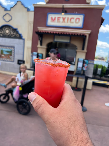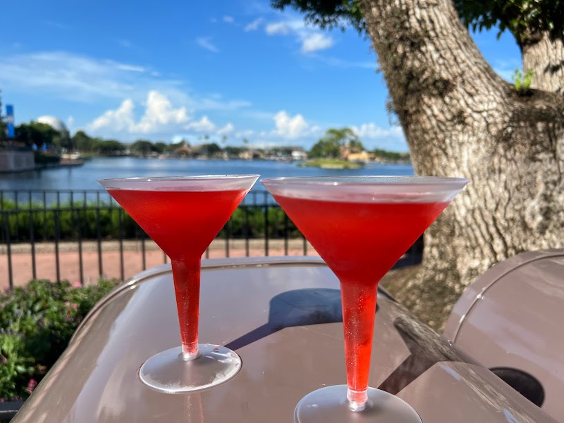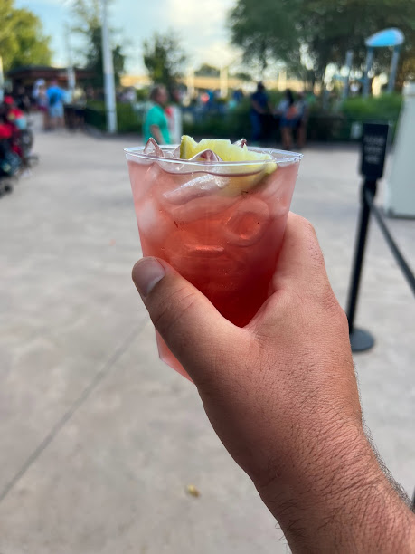 After we left the Ratatouille area, Mikey and I stopped at the France Food & Wine booth for what started as a Frozen Parisian Cosmo Slush (Vodka, Grey Goose Le Ctiron Vodka, Grand Marnier and Cranberry Juice). But like, on account of we were obviously vacationing in literal Hell, they melted within like a minute of walking away from the booth.