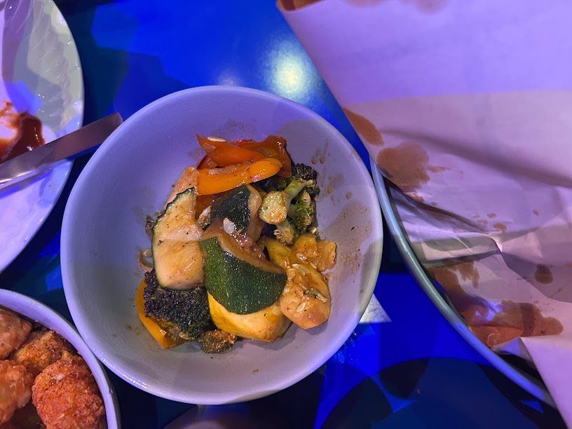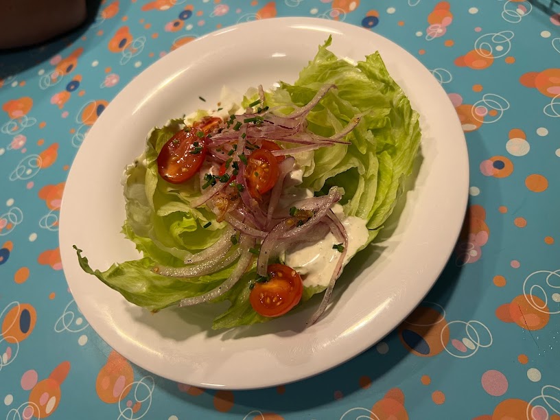 Both Nickie and I were in the mood for Cousin Amy’s Iceberg Wedge (Rice Paper Bacon, Sliced Red Onions, Cherry Tomatoes, Chives, and Plant-based Ranch Dressing) so we split it. And they did a hell of a job splitting this wedge.
