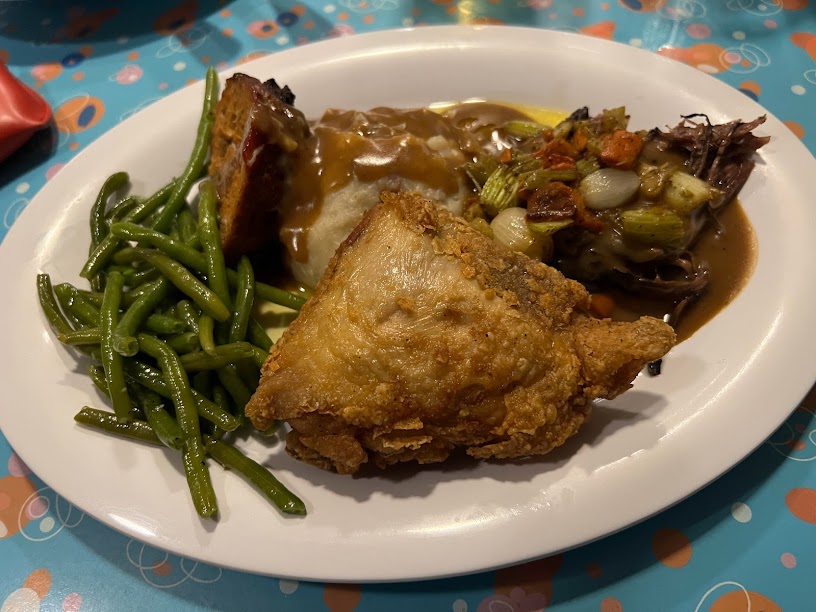 And for my main, I ordered basically what I always order at 50s Prime Time – A Sampling of Mom’s Favorite Recipes (Golden-fried Chicken, Fork Tender Pot Roast, and Traditional Meatloaf with all the fixin’s).