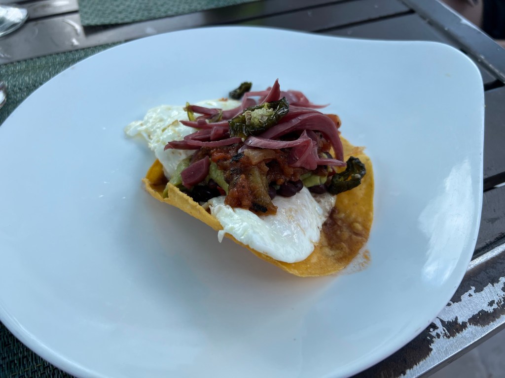 And the Key West Egg Tostada (Corn tortilla, charred tomato salsa, avocado puree, fried egg, candied jalapeños).