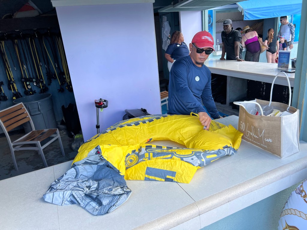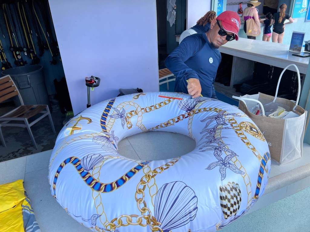 So Nickie and I grabbed the floats we brought down to the dive shop to have them blown up. Here’s Nickie’s. Sort of a bougie nautical theme.