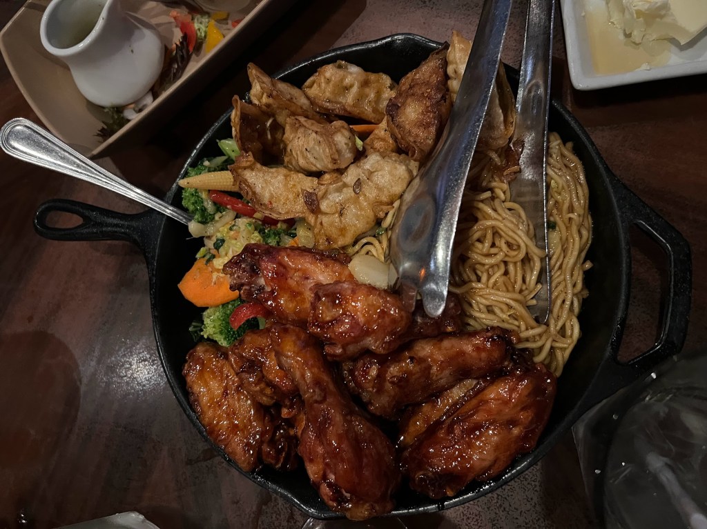Up there, we got a skillet filled with Honey Coriander Wings, Pork Dumplings tossed in Garlic-Chili Sauce, ‘Ohana Noodles with Mirin-Teriyaki, and Stir-Fried Vegetables.