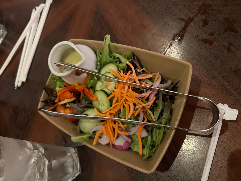 Our waiter came over and took our drink orders. Then at around 8:15, he brought out the first course of the night – a Mixed Greens Salad with Citrus Vinaigrette and some warm ‘Ohana Bread with Honey Butter.