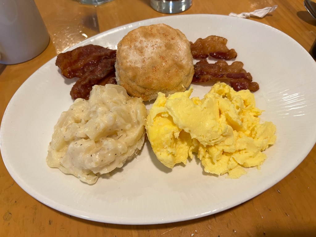 And I went with Olivia’s Breakfast (Two Eggs-Any Style, Olivia’s Potatoes, Buttermilk Biscuit and served with choice of Bacon or Sausage).