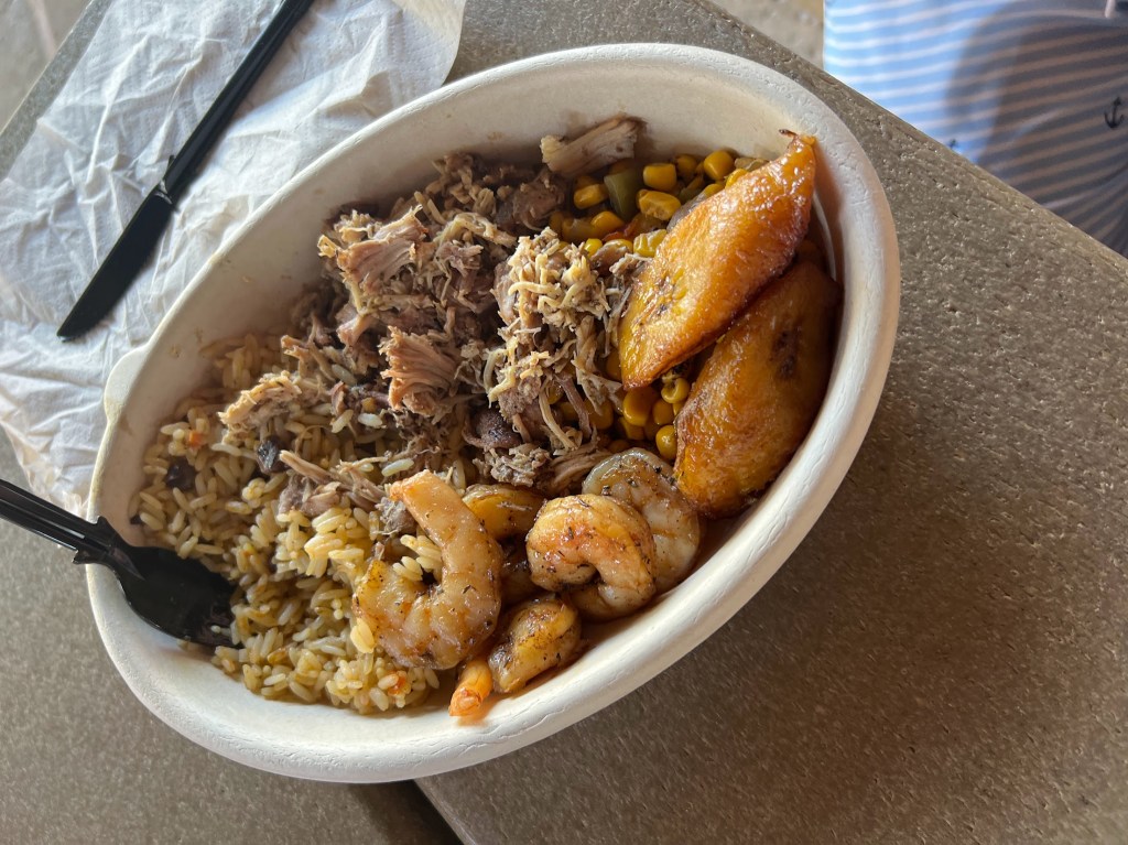 Up there, we have some Peel-n-Eat Shrimp coated with ‘Ohana Seasoning, Grilled Chicken with Guava-Pineapple Glaze, and Wood Fire-grilled Black Pepper-Mirin-Teriyaki Beef.