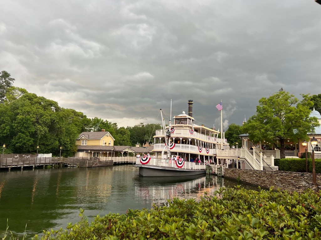 After dinner, we walked outside to a pretty threatening sky. I also took this opportunity to snap a picture of the Liberty Belle Riverboat and the Rivers of America since next time we get down here, this whole thing is gonna be gone.