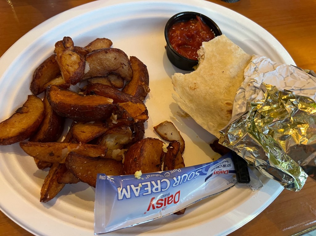 For breakfast today, I went with the Breakfast Burrito (Eggs, Bacon, and Cheddar served with Breakfast Potatoes).