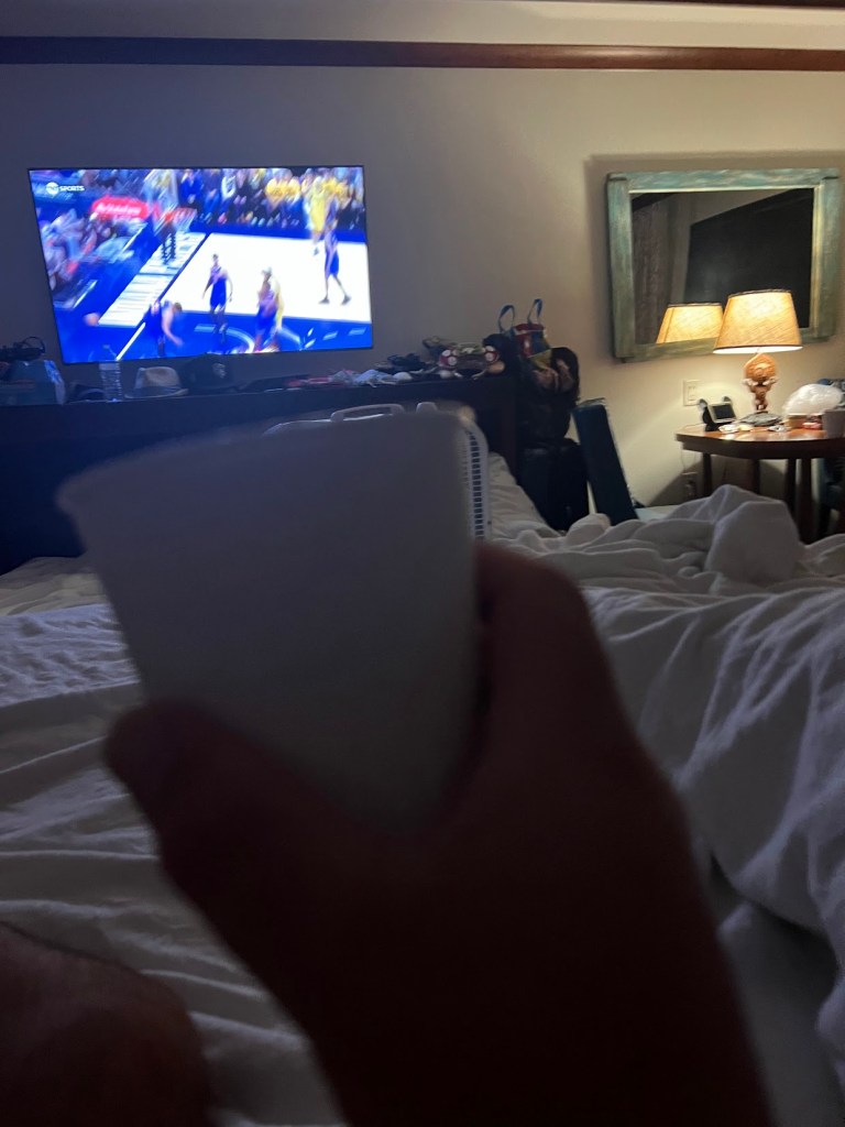 We were on the monorail by 9:15 and back in the room shortly thereafter. And not much happened beyond that. Looking at this picture, I assume I poured myself some bourbon (we had a bottle of Bib and Tucker in the room) and watched some basketball before going to bed.