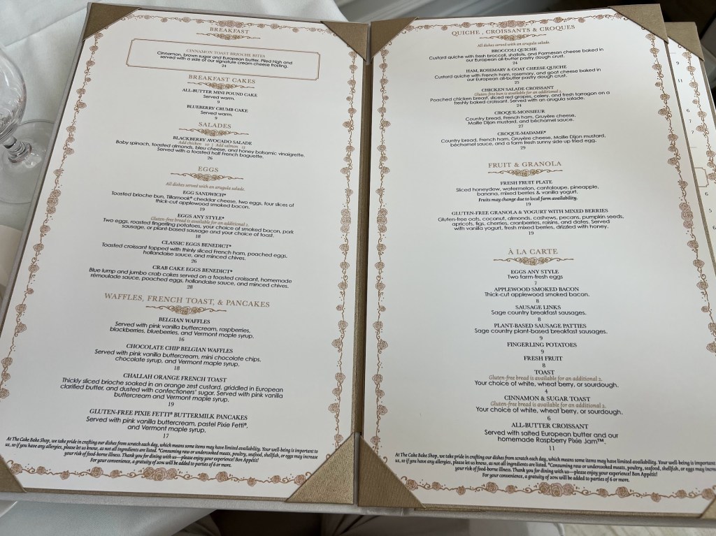 The menu lists this as being served with Raspberries, Blackberries, Blueberries, Vermont Maple Syrup, and Pink Vanilla Buttercream.