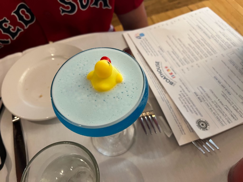 Myles went with a signature Boathouse cocktail – the Duck Duck Razz (SKYY Raspberry Vodka, Blue Curacao, Lemon Juice, Simple Syrup). And it comes with a cute little duck on the top, which I think makes this drink really fun for the kids.