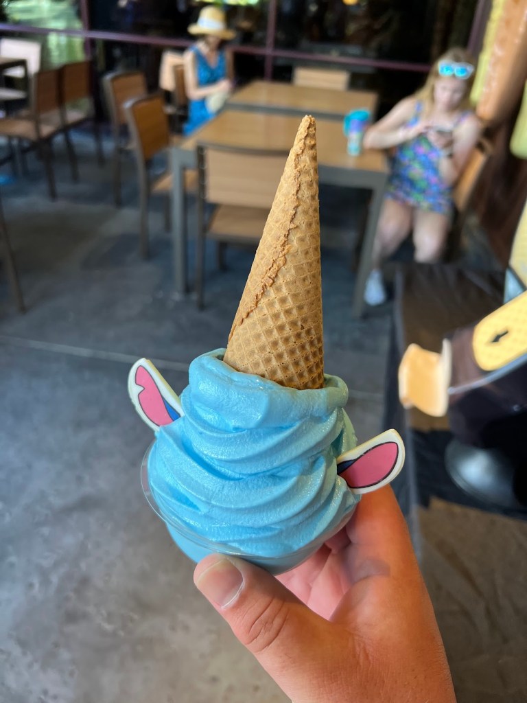 Specifically, I wanted to try the Experiment 626 Cone, which was part of all these limited offerings celebrating Stitch on account of the live-action movie having just come out. This here is blue vanilla soft serve with a cotton candy flavor and white chocolate Stitch ears.