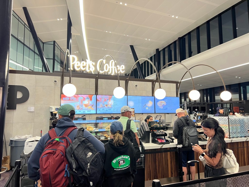 Since we had first class waiting for us and all the food-ness it promised, I figured I would wait for breakfast. But Nickie, in her condition, wanted to try and find something to bring on the plane she knew would be safe. I had called ahead to try and get her a meal she could eat, but just in case.